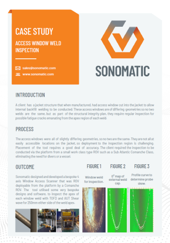 A Sonomatic projetou e desenvolveu um scanner de 4 eixos sob medida que é lançado por um ROV a partir da plataforma de um Comanche ROV, para acessar a área através da janela de acesso. A ferramenta utilizou alguns designs sob medida muito específicos e software para inspecionar o topo de cada solda da janela com TOFD e ondas transversais AUT para 250mm de cada lado desta região.
