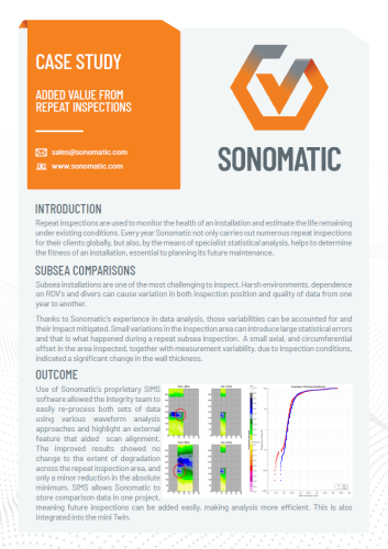 Com o uso do SIMS, software da Sonomatic, foi possível para a equipe de integridade reprocessar facilmente ambos os conjuntos de dados, aplicando diferentes métodos de análise de forma de onda e destacar uma característica externa que ajudou no alinhamento da varredura. Os resultados aprimorados mostraram que não houve alteração na extensão da degradação na área da inspeção recorrente, e apenas uma pequena redução no valor absoluto mínimo. O SIMS permite que a Sonomatic armazene dados de comparação em um único projeto, facilitando a inclusão de futuras inspeções e tornando a análise mais eficiente. Isso também está integrado ao mini Digital Twin.