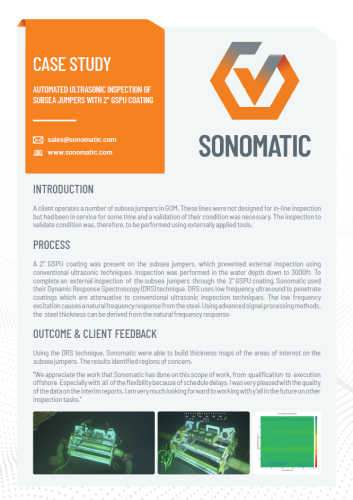 Para realizar uma inspeção externa dos jumpers submarinos através do revestimento GSPU de 2 polegadas, a Sonomatic utilizou sua técnica de Espectroscopia de Resposta Dinâmica (DRS). A DRS usa ultrassom de baixa frequência para penetrar revestimentos que são atenuantes para as técnicas de inspeção ultrassônica convencionais. A excitação de baixa frequência causa uma resposta de frequência natural do aço. Usando métodos avançados de processamento de sinal, a espessura do aço pode ser derivada da resposta de frequência natural.