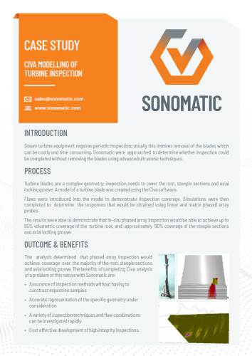 Equipamentos de turbinas a vapor exigem inspeções periódicas; normalmente isso envolve a remoção das pás, o que pode ser custoso e demorado. A Sonomatic foi procurada para determinar se a inspeção poderia ser realizada sem a necessidade de remover as pás, utilizando técnicas avançadas de ultrassom.