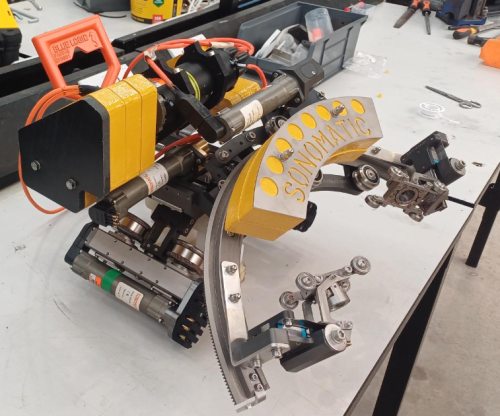 Para atender a esse desafio, o grupo de Engenharia de Projeto e Desenvolvimento (E2I) da Sonomatic identificou o scanner Stingray da Sonomatic como a plataforma de ferramenta ideal para se adaptar às necessidades do cliente. O Stingray foi modificado para permitir a implantação por ROV, a inspeção em torno de curvas e o acesso à região restrita de 6 horas.