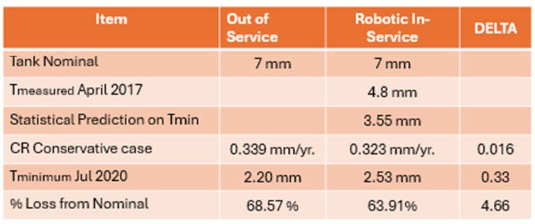 A inspeção robótica realizada com o tanque de petróleo bruto de 80 metros de diâmetro, ainda em operação e com acúmulo de borra (sludge) de até 1 metro, forneceu dados que, quando projetados para o momento da medição fora de operação com ultrassom (UT), mostraram-se extremamente precisos e comparáveis.