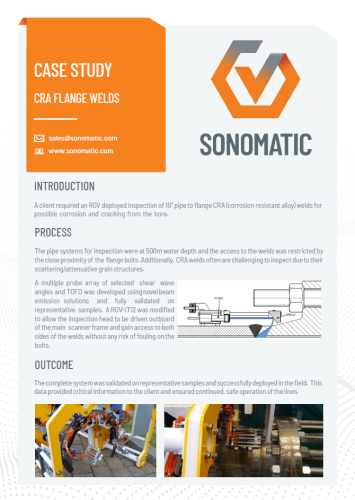 Um cliente solicitou uma inspeção através de ferramenta lançada por ROV de soldas de um flange de 10" em tubulação CRA (Corrosion Resistant Alloy) para checagem de possível corrosão e existência de trinca a partir do furo.