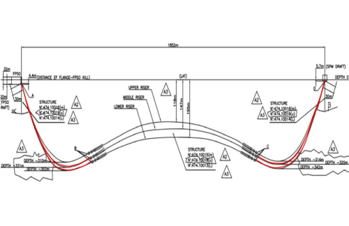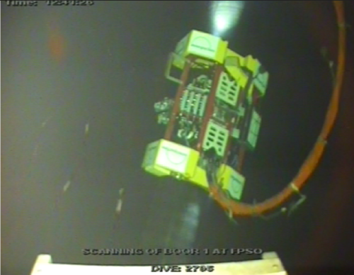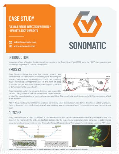 Inspeção de dois risers flexíveis de offloading, desde o topo até o ponto de contato com o leito marinho (TDP), utilizando a ferramenta de varredura MEC™-Hug. Comprimento total inspecionado: 2.374 m em dois trechos.