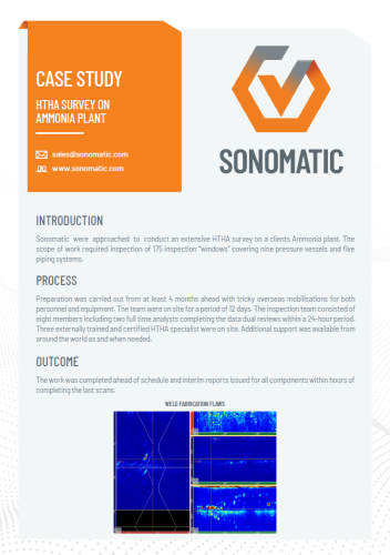 A Sonomatic foi contratada para realizar uma ampla inspeção visando à detecção de HTHA (High Temperature Hydrogen Attack) em uma planta de amônia de um cliente. O escopo do trabalho envolveu a inspeção de 175 “janelas” de acesso, abrangendo nove vasos de pressão e cinco sistemas de tubulação.