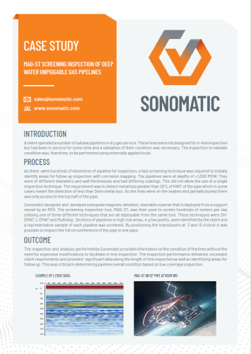 A Sonomatic projetou e desenvolveu um scanner sob medida, com rodas magnéticas e capacidade de navegação, que é lançado a partir de uma embarcação de apoio por meio de um ROV. A ferramenta de varredura, chamada MAG-ST, foi utilizada para inspecionar centenas de metros por dia, empregando uma das três técnicas diferentes, todas aplicáveis com a mesma ferramenta: SH EMAT, L-EMAT e Multiskip. As seções dos dutos em áreas de alto risco — como pontos baixos — foram identificadas pelo cliente, e uma amostragem representativa de cada duto foi inspecionada. Posicionando os transdutores nas posições de 2 e 10 horas foi possível inspecionar toda a circunferência do duto em uma única passada.