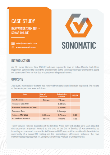 Um tanque de água bruta com 18 metros de diâmetro precisou passar por uma inspeção robótica online do fundo para extensão da certificação, já que estava previsto para uma grande manutenção, mas não podia ser retirado de operação devido à exigência de volume operacional mínimo.