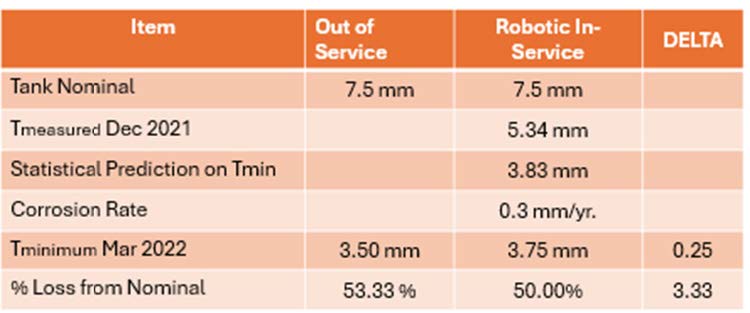 A inspeção robótica com o tanque em operação, com presença de lodo de até 0,5 m, forneceu dados que, quando projetados para o momento da inspeção com o tanque fora de operação (UT), foram considerados extremamente precisos e comparáveis.