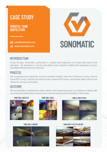 Em apenas 30 dias, a Sonomatic realizou a inspeção robótica de cinco tanques que estavam em plena operação. Todo o processo foi conduzido sem a necessidade de paradas ou interrupções nos serviços, tornando a inspeção extremamente eficiente e econômica.