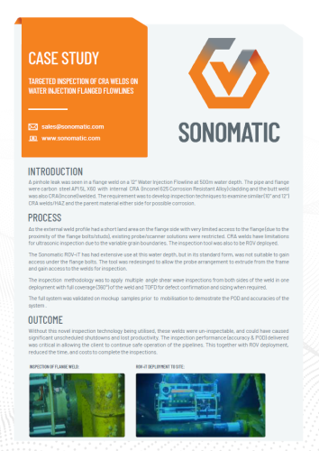Foi identificado um vazamento por perfuração em uma solda de flange de uma linha de injeção de água de 12” a 500 metros de profundidade. O tubo e o flange eram de aço carbono API 5L X60, com revestimento interno em liga resistente à corrosão (CRA) — Inconel 625 — e a solda de topo também era realizada com material CRA (Inconel). O objetivo era desenvolver técnicas de inspeção de dutos para avaliar (10” e 12”) soldas CRA semelhantes, a ZTA (Zona Termicamente Afetada) e o material base em ambos os lados, para verificação de possíveis corrosões.