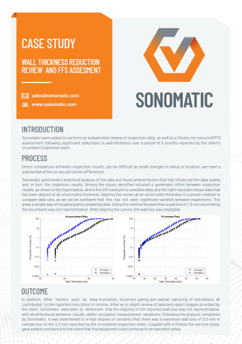 A Sonomatic foi contratada para realizar uma revisão independente dos dados de inspeção, bem como uma avaliação de fitness-for-service (FFS), após a identificação de reduções significativas na espessura da parede ao longo de um período de 6 meses, reportadas pela equipe de inspeção atual do cliente.